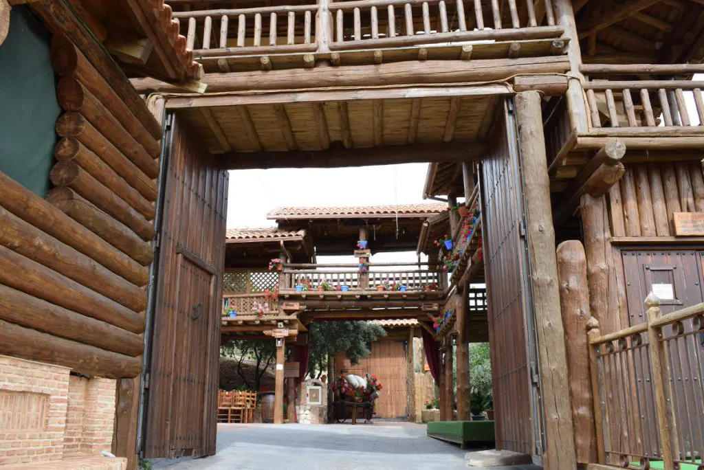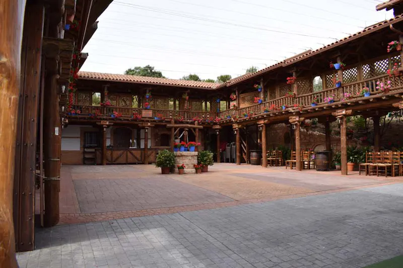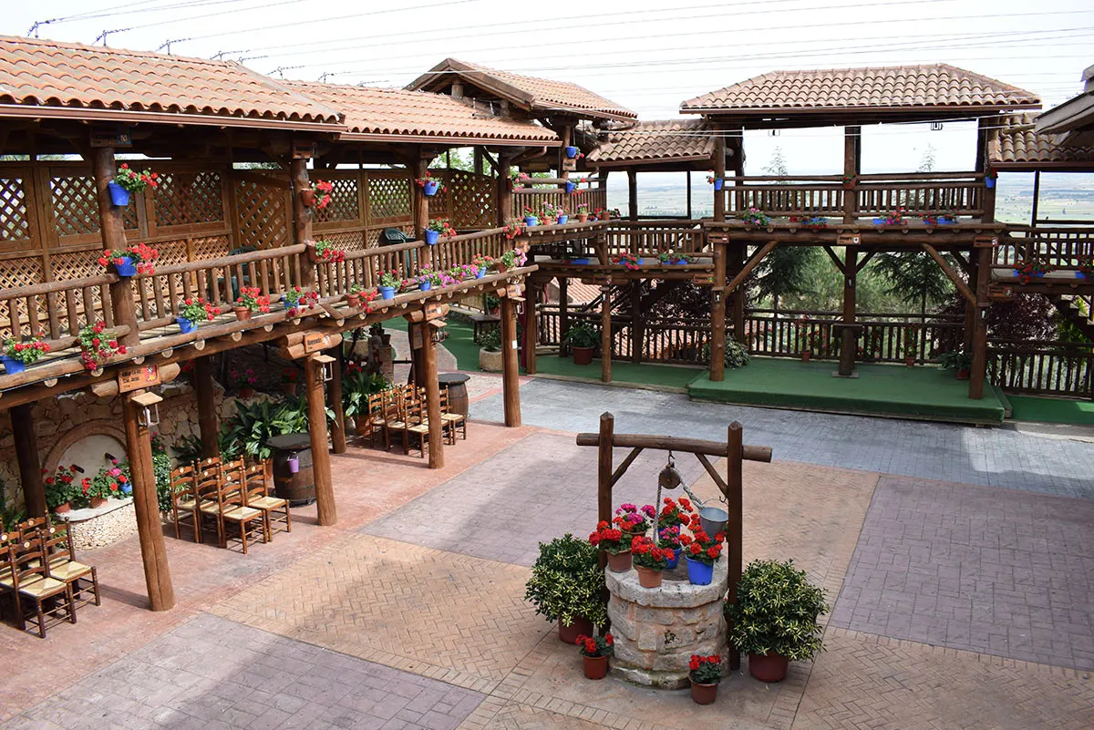 Excepcional construcción en madera de un patio típico manchego construido en tronco irregular con todos los detalles característicos como el caño del agua, el pozo, soportales, escenario, etc. y muestra distintos pueblos de Castilla La-Mancha con el escudo y distancia a dichos pueblos.